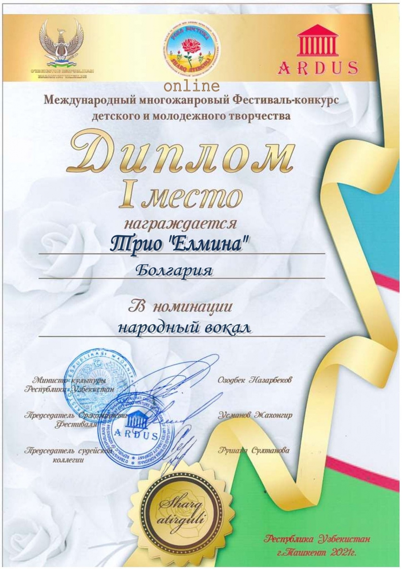 Този път от Ташкент (Узбекистан) идва новината за първото място в международния многожанров фестивал-конкурс за детско и младежко творчество "Розата на Изтока".