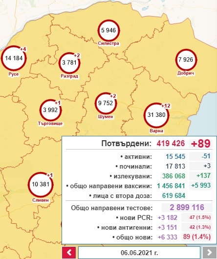 89 са новозаразените с коронавирус у нас за последното денонощие, с 67 помалко, отколкото в петък. Статистиката за денонощието по области: