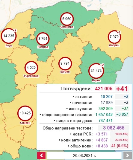 За същия период са излекувани 37 души, двама са загубили битката с коронавируса. В интензивни отделения са 207 души. Активните случаи са 10 207. Общо излекувани от началото на пандемията са 392 809 българи. За последното денонощие са поставени 3857 ваксини. Така общият брой достига 1 657 042 дози.