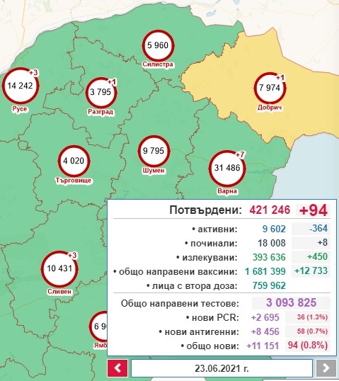 От тях заразените са 0,84%. 421,246 са случаите на новия коронавирус, потвърдени у нас към момента. 9602 от тях са активни. 450 са излекуваните лица. Велико Търново, Габрово, Монтана, Пазарджик, Силистра, Търговище и Шумен са без нови случаи.