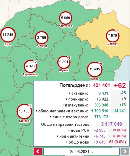 От началото на пандемията заразените у нас са общо 421 401, излекуваните - 393 948, а починалите - 18 022.