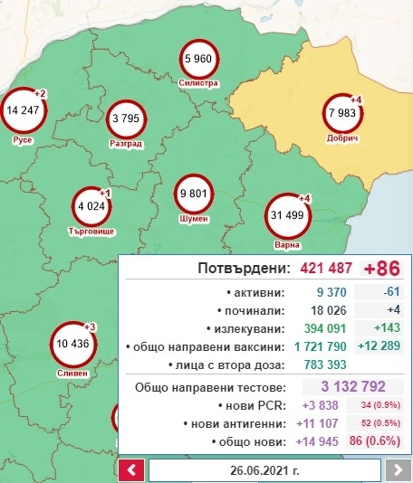 14 945 са направените тестове. От тях 3838 са PCR, а 11107 - бързи антигенни тестове. Заразените са 0,57% от изследваните. Най-много са потвърдените случаи в София - 21. Във Видин, Силистра, Разград и Шумен няма нови потвърдени случаи.