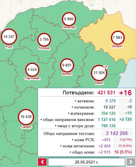 Поставените дози ваксини са общо 1 724 896. Общият брой лица със завършен ваксинационен цикъл са 784 995. Разпределението по области по настоящ адрес на новозаразените лица е, както следва: Бургас-1, Варна - 3; Видин-1,, Ловеч-2, Плевен-2, Сливен-3,Смолян-3, София- 5, София (столица) 5, Стара Загора - 2, Ямбол-1.