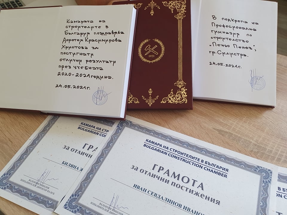 Камарата на строителите в България отличи първенците на випуск 2021 на Професионална гимназия по строителство "Пеньо Пенев" – Силистра за постигнати отлични резултати на държавните квалификационни изпити.
