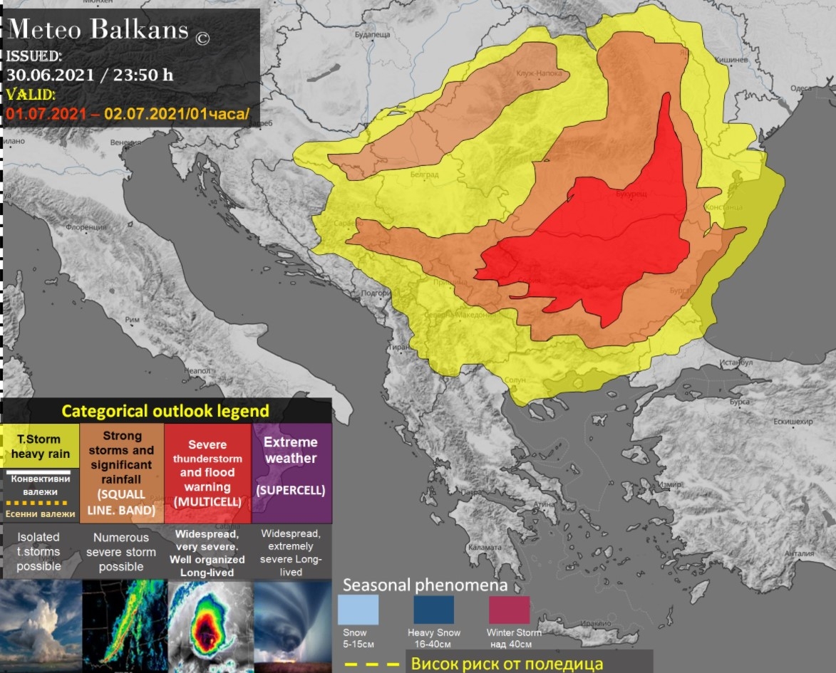 Гръмотевичните бури ще се образуват около 13-15 часа над Централна Сърбия и част от планинските райони от страната ни, като те бързо ще се организират и ще обхванат голяма площ от България и Румъния ще се образуват мощни мезо-конвективни системи , клетките ще са с дълъг живот.