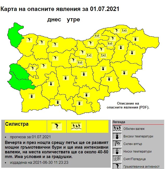 Прогнозата конкретно за област Силистра предупреждава, че вечерта и през нощта срещу петък ще се развият мощни гръмотевични бури и ще има интензивни валежи, на места количествата ще са около 40-50 mm. Има условия и за градушки.