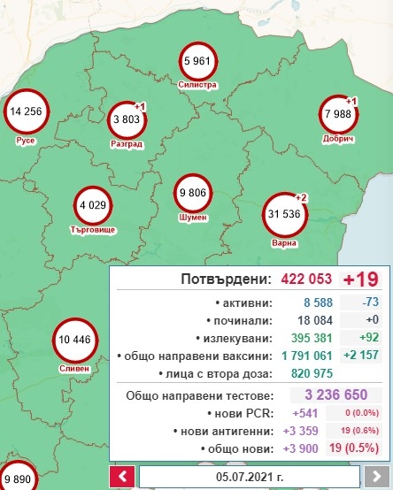 Така общият брой на потвърдените случаи става 422 034, от които активни са 8661. 7 са излекуваните през последното денонощие, а общият им брой е 395 289. Поставените дози ваксини са общо 1 788 904, като 3597са ваксинирани за денонощието . Хоспитализираните са 1315, от които 154 се намират в интензивното отделение.