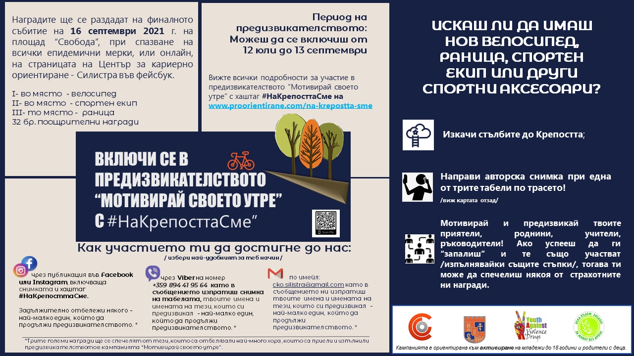 В периода 13 юли – 13 септември 2021 г. – да изкачи стълбите до Крепостта, да направи снимка пред някоя от табелите на кампанията, които вече са по трасето на стълбите, да я публикува във Facebook или Инстаграм, като сложиш хаштаг #НаКрепосттаСме и мотивира, отбелязвайки някого друг! /Снимката може да се изпраща и по Вайбър и/или Имейл като алтернатива за участие/.
