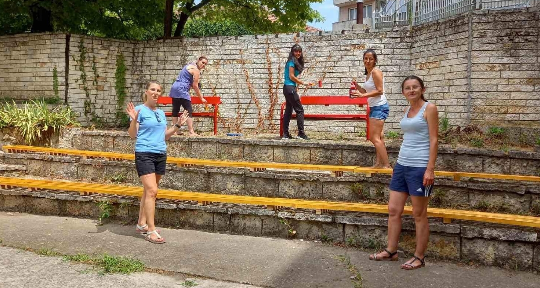Всички пейки и детски съоръжения са обновени и боядисани, почистени са тревните площи и дворът е подходяща сцена за провеждане на събития на открито.