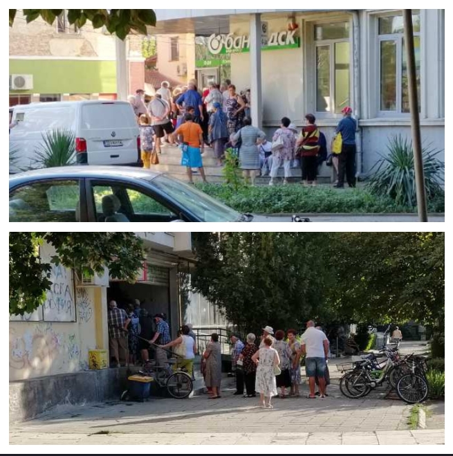 Само единици от тях, които чакаха за месечните си средства, бяха с маски, но за сметка на това се бяха струпани плътно един до друг.