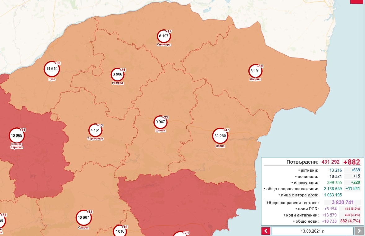 В страната новозаразените с коронавирусната инфекция са 882. Това са 4,7 % от всички направени 18 733 теста. В болници са прието 1264 пациенти с положителен тест за COVID-19, като 106-ма са настанени в интензивни отделения. Починали са 15 души с коронавирусна инфекция, 228 са излекувани.