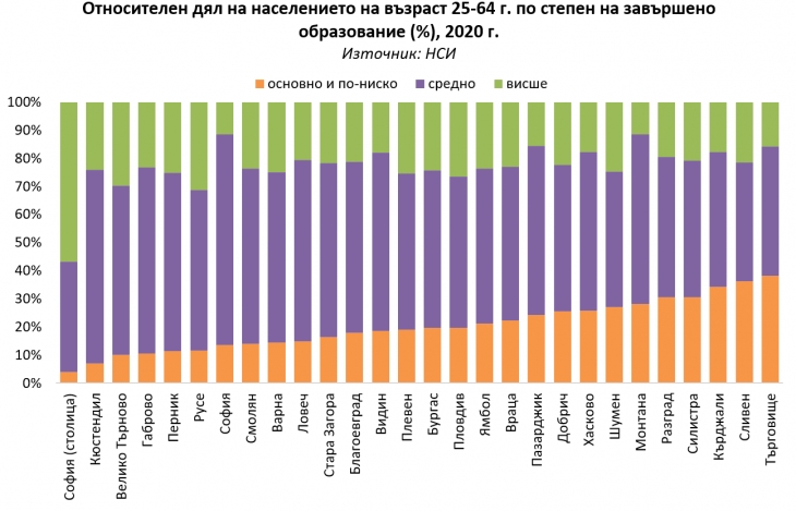 Средно за страната 17% от населението на 25-64 г. са с основно и по-ниско образование, 54% - със средно, а 29% - с висше образование. На областно ниво столицата отново е с най-високообразованата работна сила. Делът на висшистите достига 57%, а населението с основно и по-ниско образование е едва 4%. Сред областите с най-високообразованото население се отличават Велико Търново, Русе, Варна. Областта с най-ниско образовано население пък е Търговище, където 38% от работната сила е с основно и по-ниско образование.