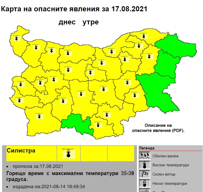 Жълт код за опасно високи температури е в сила за област Силистра 16 Август 2021 г. Новини 1836 Жълт код за опасно високи температури е в сила за област Силистра за 17 август. Това сочи справка в сайта на Националния институт по метеорология и хидрология. Очаква горещо време, с максимални температури в диапазона от 35 до 39 градуса