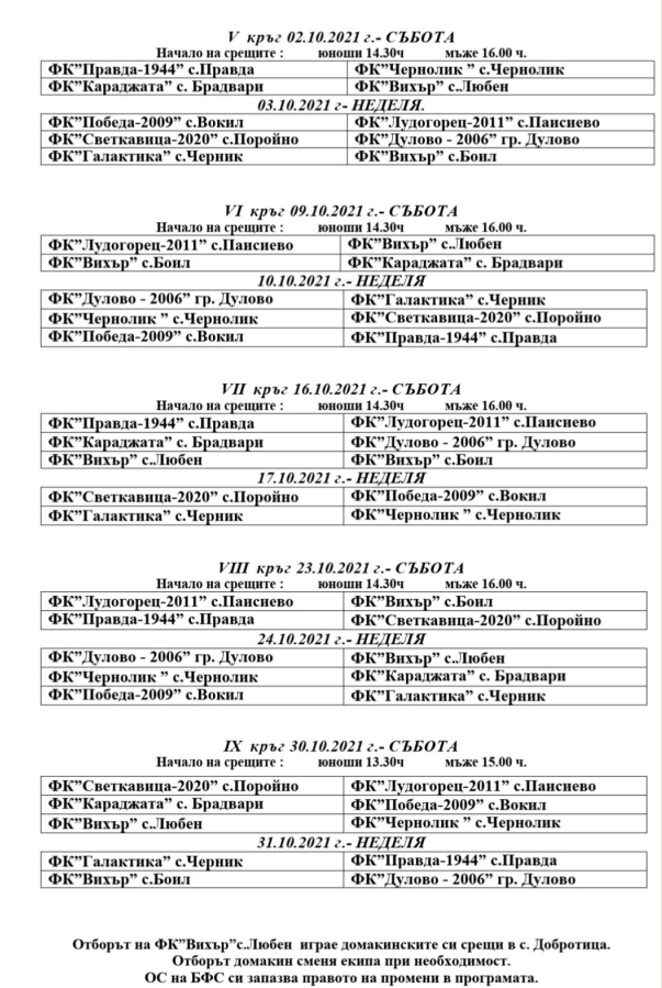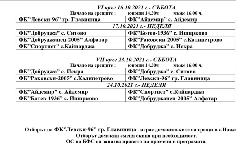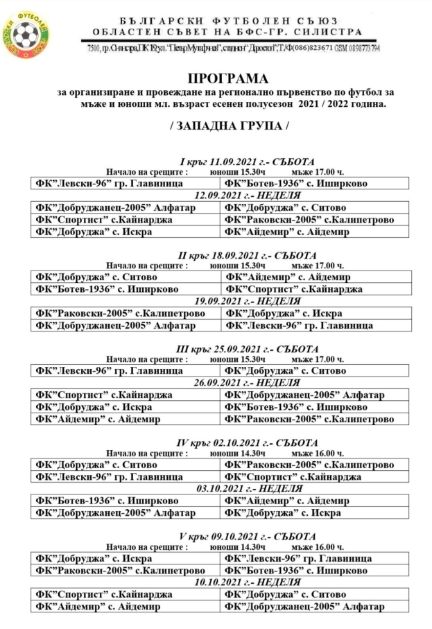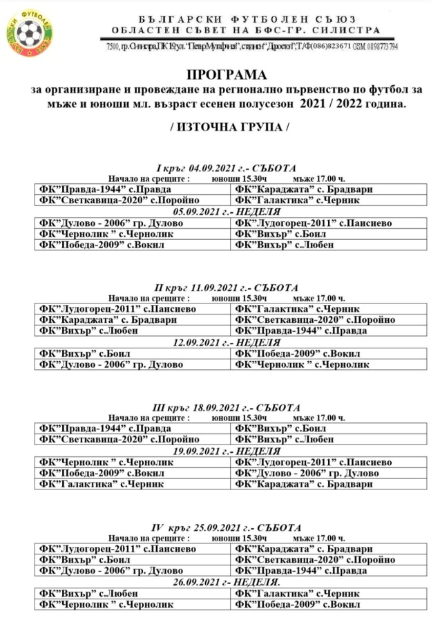 Пълна програма на есенния полусезон на регионалното първенство по футбол на област Силистра можете да видите на прикачените файлове.