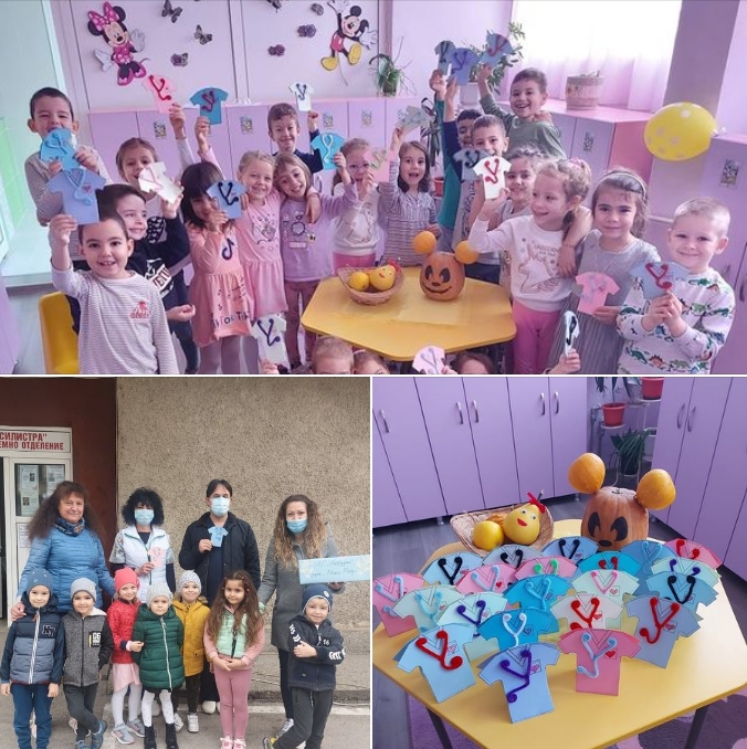 С помощта на своите учителки Диана Великова и Росица Димитрова деца от група "Мики Маус" при ДГ "Добруджа" в Силистра изработиха 22 картички и ги отнесоха на лекарите от спешния център в Силистра, за да ги поздравят с празника.
