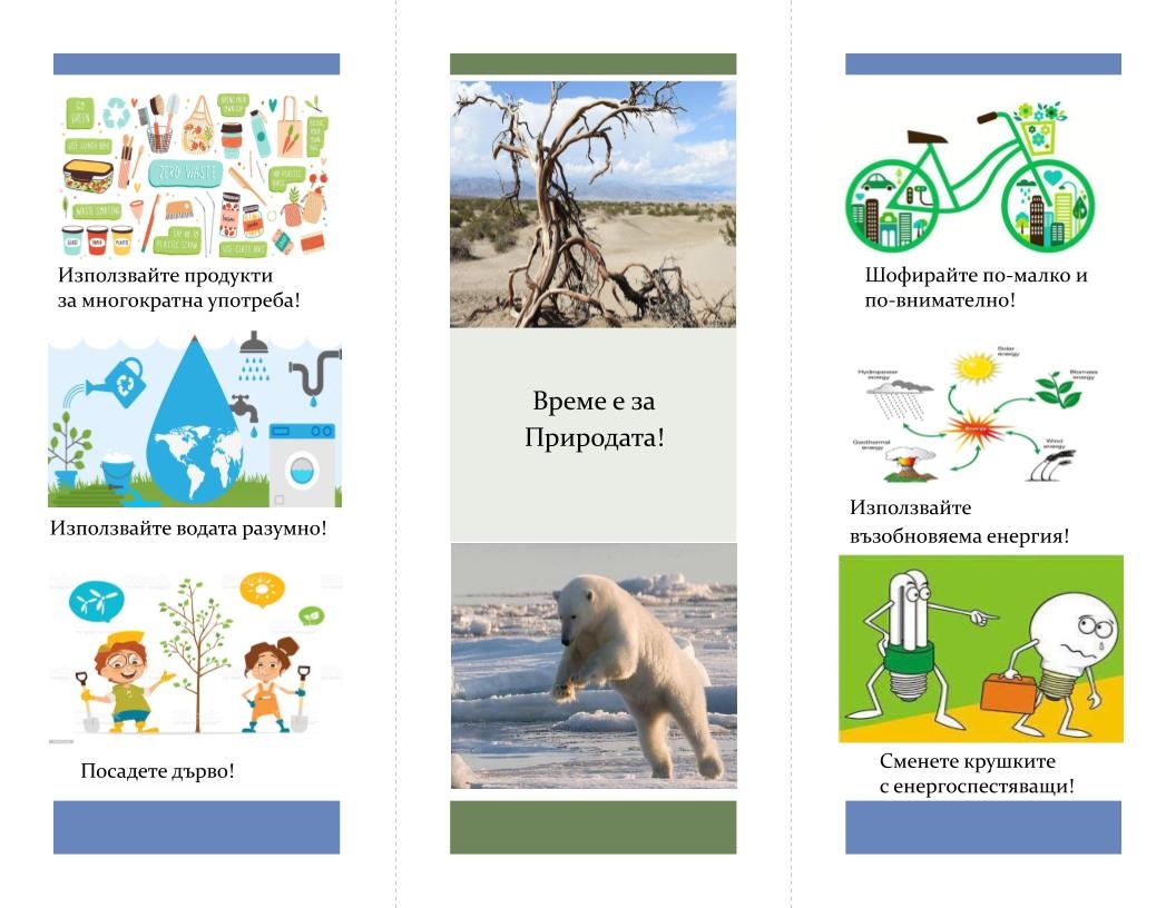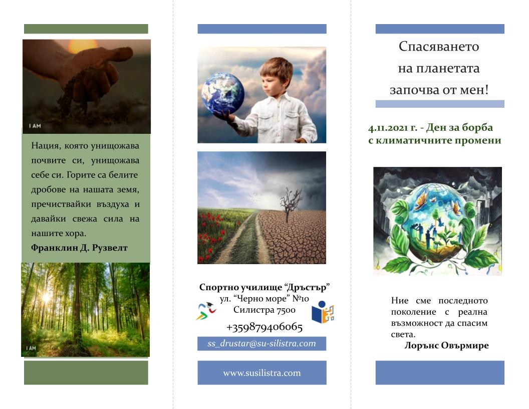 Учениците от Спортно училище "Дръстър" – Силистра изразиха своята гражданска позиция по отношение глобалното затопляне чрез специално изработени по темата брошури и флаери, които разпространиха сред гражданите на град Силистра.