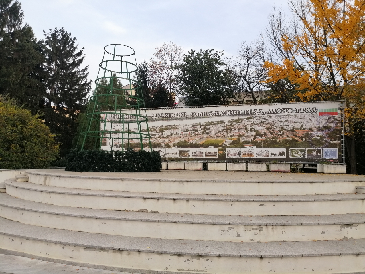 На сцената на площад "Свобода" започна монтажа на празничната елха, която ще бъде по-късно и украсена с множество лампички.