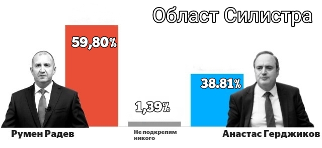 Анастас Герджиков и Невяна Митева засега получават 38,81 % или 11 439 от вота на гласоподавателите от област Силистра, а 1,39% не са подкрепили никого.