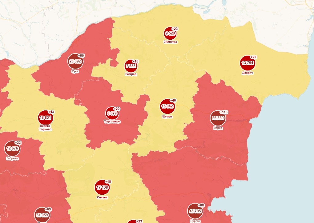 Област Силистра остава в жълтата зона, като новозаразените на 100 000 души за последните 14 дни са 232, като от съседните области - Добрич, Шумен, Разград и Русе, като само последната остава в червената ковид зона.
