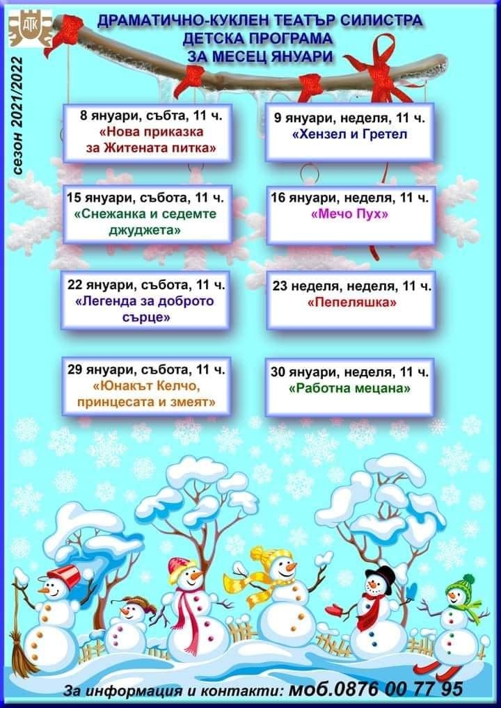 От 8 януари започват детските ни представления, всяка събота и неделя от 11 часа, съобщи Златина Станева, директор на Драматично-куклен театър за Общинско кабелно радио "Силистра".
