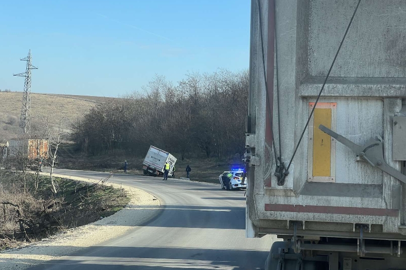 Товарен камион с румънска регистрация напуска пътя в участък, където той прави завой и се спуска. След като излиза извън очертанията на пътя камиона се забива крайпътната канавка.