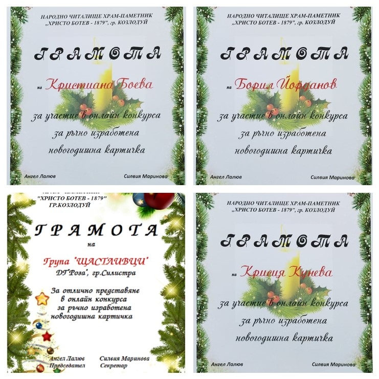 Децата от Група "ЩАСТЛИВЦИ"- II - А, ДГ"Роза", гр.Силистра, бяха удостоени с грамоти за отлично представяне на онлай конкурс на Народно читалище Храм-паметник "Христо Ботев-1879", гр.Козлодуй, за ръчно изработена новогодишна картичка.