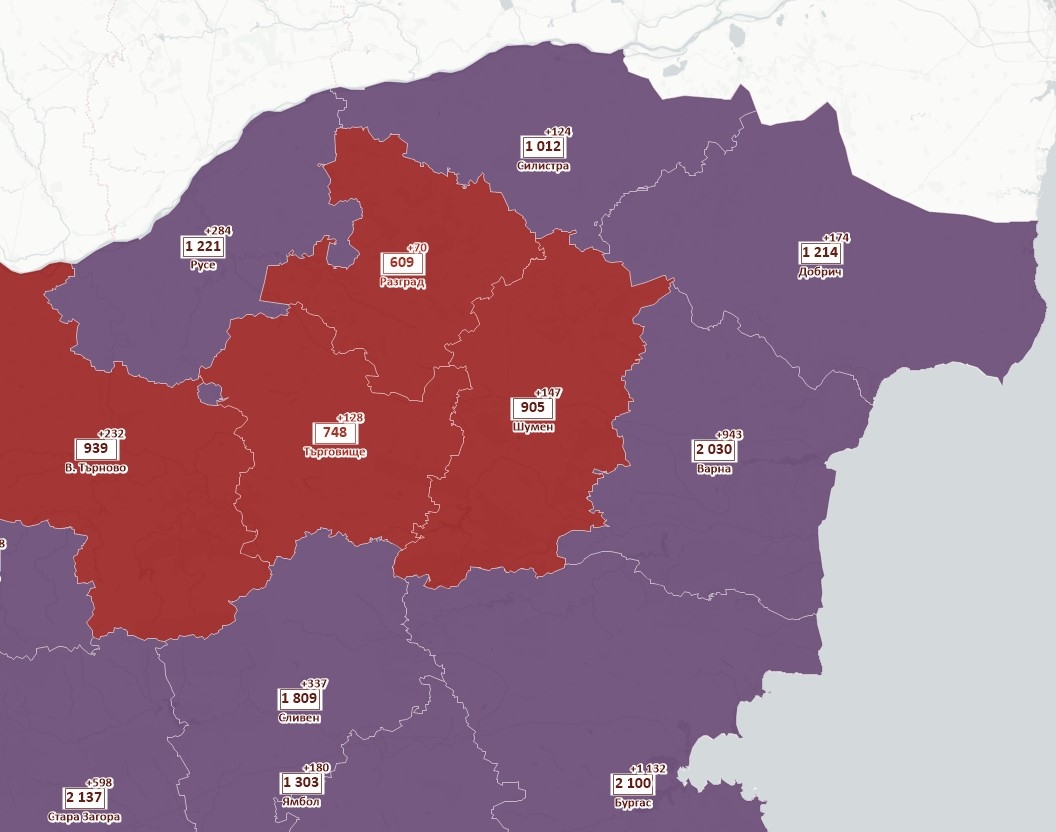 Област Силистра вече е в лилавата COVID зона с 14-дневна заболеваемост от 1 012 на сто хиляди души, сочи справка с Единния информационен портал.