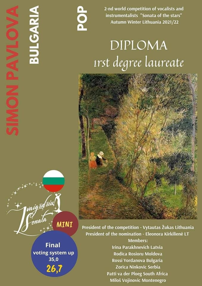 На зимното издание на Международния фестивал Sonata of the Stars в Литва, участие в който взеха деца и младежи от 21 държави, представител на България бeше Симон Павлова.