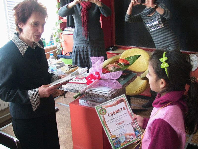 Възпитаничката на СОУ "Н.Й.Вапцаров" Александрина Андреева Енчева от 3 "А" клас спечели 1-во място на Областния кръг на националното състезания "ЗНАМ И МОГА". Днес пред погледа на съучениците на Алекс, директора на училището Бисерка Костова й връчи книги, като награда за постигнатия успех. Букет цветя бе връчен и на класният ръководител на отличничката - г-жа Стефка Стоянова. Тя сподели за следващият проект "България – това е моята родина!", изработван по идея на Алекс. По него са изработени седем книжки на родолюбива тематика от учениците на 3 "А" клас. Самият проект ще бъде представен от Алекс на областното състезание по гражданското образование.
