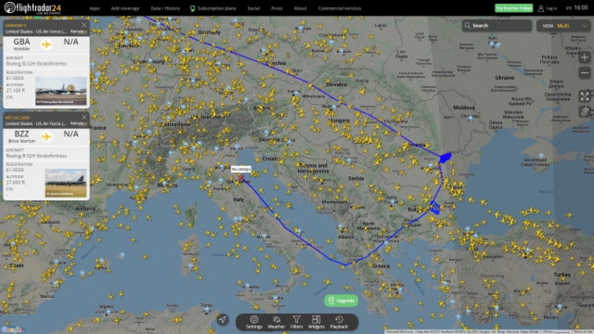 Два американски стратегически бомбардировача B-52 "Стратофортрес" са направили обиколка на българското небе в късните следобедни часове на вчерашния ден, включително и над Силистра, показват данни от платформата за следене на самолети Flightradar24.