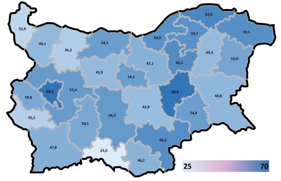 Високият резултат на София е обусловен от високото съответствие между учащи и наети в ИКТ и в селското стопанство. Именно столицата е областта с едни от най-високи дялове на учащите и наетите в ИКТ и съответно - най-ниски дялове в земеделието. Област Кюстендил пък е с най-малко ученици в ИКТ и съответно най-малко наети в сектора. В областите Перник, Враца и София подготвяните ученици за работа в ИКТ сектора са значителен дял, но наетите - не. Друг такъв случай е областта с най-нисък резултат в индекса - Смолян, където приемът в ИКТ специалности е с най-висок дял в страната, докато наетите са с най-нисък. Вероятно след завършването си младежите ще търсят работа по квалификацията си в други области. Доброто представяне на областите в Добруджа, по-специално Силистра, Добрич и Разград, е обусловено от сравнително големия дял на селското стопанство и икономиката им, което отговаря и на по-високия дял на приема в селскостопански специалности в професионалното образование.