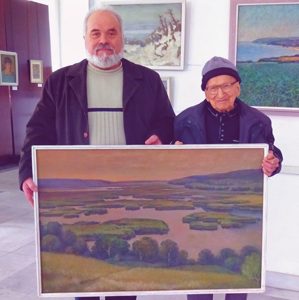 Една от тях той дари на Художествената галерия в града (на снимката е Йорда Колев - директор на галерията), с която обогатява своя принос за фонда й. Ретроспективната експозиция има и характер на базар, така че и други меценати могат да използват възможността, за да закупят картина - за себе си, но и за самата галерия - домакин на уникалната проява.