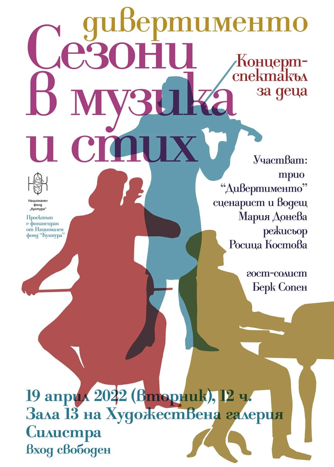 Художествената галерия в Силистра ви кани утре на 19 април от 12.00 часа в зала 13 на концерт-спектакъл за деца - "Сезони в музика и стих".
