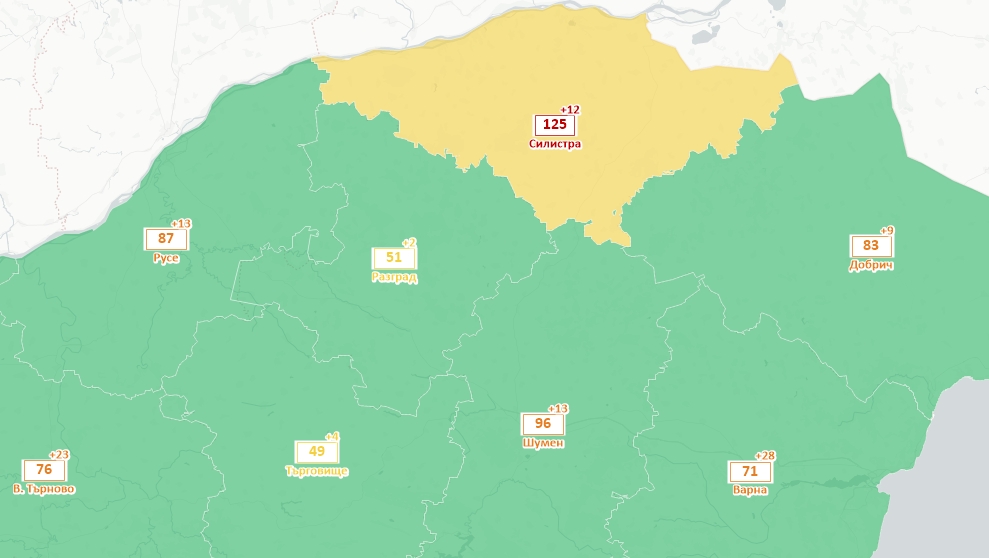 За 14 дни заболеваемостта е 125 на 100 000 души население, като е най-висока на Североизток и Силистренско остава единствената в жълтата ковид зона.