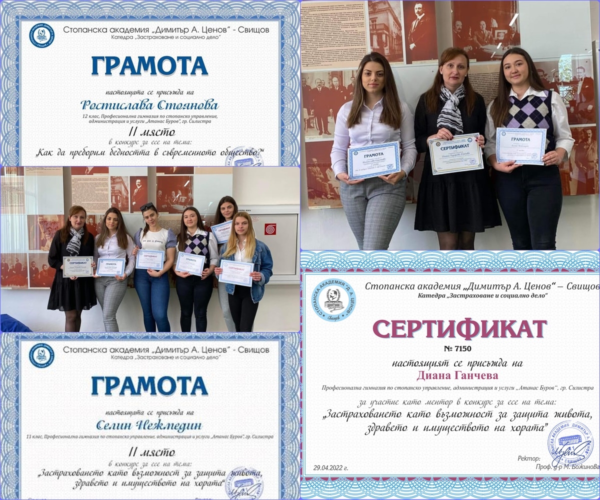 Конкурсът се проведе в две направления: 1. " Застраховането като възможност за защита живота, здравето и имуществото на хората" Селин Нежмедин, 11б клас (ВТОРО МЯСТО) 2." Как да преборим бедността в съвременното общество" Ростислава Стоянова, 12б клас (ВТОРО МЯСТО). За заетите призови места в организираното от катедра " Застраховане и социално дело" ученическо състезание ПГСУАУ получи Благодарствено писмо лично от доц.д-р Венцислав Василев, Ръководител на катедрата.