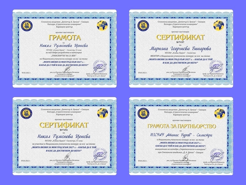 Отличие за ПГСУАУ ,,Атанас Буров" в Националния ученически конкурс "Моята визия за моя град към 2027 г. – какъв да е той и как да достигнем до него?".