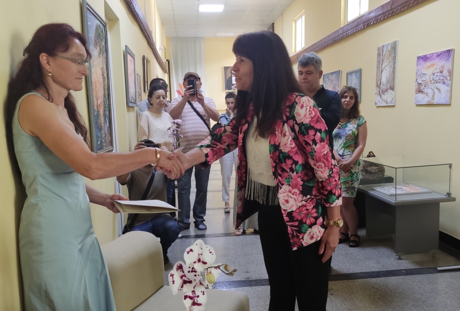 С участието на областния управител Катя Кръстева, на нейния заместник Минчо Йорданов, както и на представители на различни институции, премина откриването на изложбата "Родината...", подредена в Регионална библиотека Силистра от нейния автор Весела Думанова.