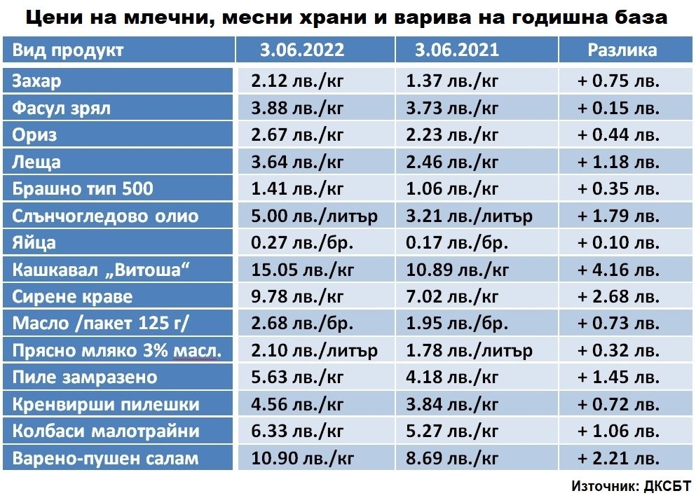 От синята таблицата е видно, че на годишна база всички млечни, месни и други храни, вкл. и варивата са поскъпнали, а с над 1 лев са се повишили цените на 6 от общо 20 продукти, като най-голяма е разликата при кашкавала "Витоша" (+4.16 лева) и при кравето сирене (+2.68 лева).