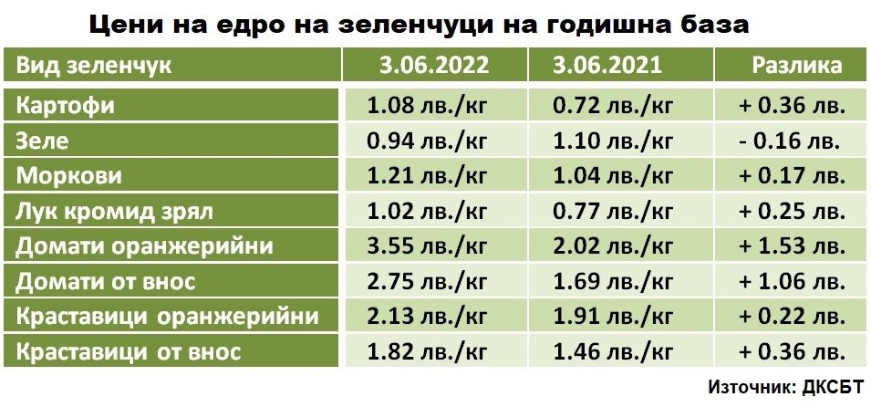 От зелената таблица е видно, че на годишна база са поскъпнали всички зеленчуци, с изключение на зелето, а с над 1 лев са се повишили цените на оранжерийните домати и доматите от внос.