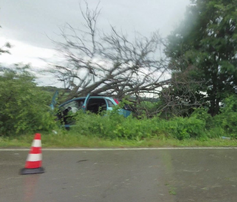На мокър участък от пътя водача губи контрол над Опел Корса и излита от пътя, като се забива в крайпътно дърво. Вследствие на удара дървото пада върху колата.