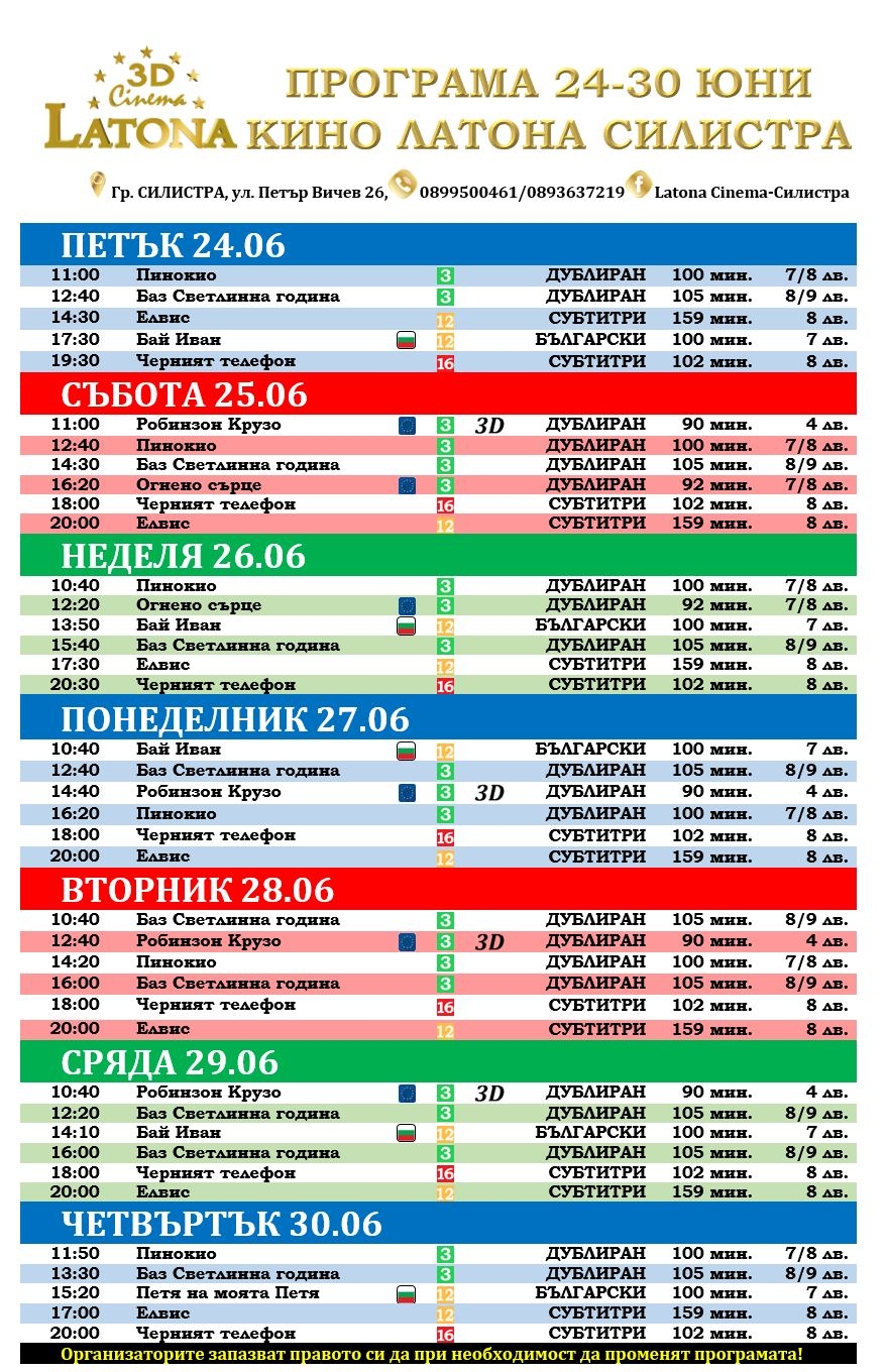 Latona Cinema Силистра: Кино програма - 24.06-30.06.2022 23 Юни 2022 г. Култура 1048 Новата филмова седмица е тук в Силистра с дългоочаквани и вълнуващи премиери за малки и големи: 🍿🎬🎥ЕЛВИС🎥🕺🎤🎙 🍿🎬🎥ЧЕРНИЯТ ТЕЛЕФОН🎥 📞☎️🧸 Също така, ако до сега не сте го направили, все още можете да гледате 🎥БАЗ СВЕТЛИННА ГОДИНА🎥👨🚀 🚀