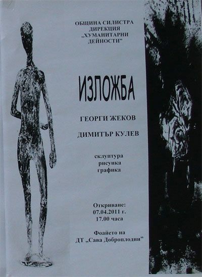 Днес от 17,00 ч. във фоайето на Драматичния театър, с помощта на община Силистра, ще бъде открита съвместната изложба на графикът Димитър Кулев и скулпторът Георги Жеков. Двамата са представители на Групата на СБХ в Силистра. Те ще представят пред силистренци скулптори, рисунки и графики. Планирано е изложбата да продължи до месец май.