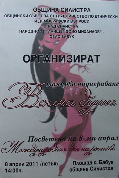 Днес от 14.00 часа на площада в село Бабук ще се състои танцово надиграване "Волна душа", посветено на 8-ми април, Международния ден на ромите. Организаторите на мероприятието са община Силистра, чрез Общинския съвет по етнически и демографски въпроси и Народно читалище "Дочо Михайлов" – село Бабук