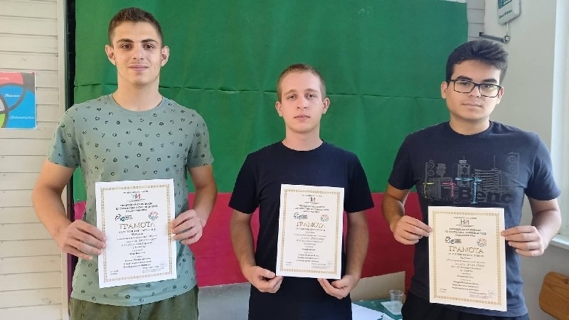 Отборът на учениците от XIа клас – Михаил, Иван и Божидар (на снимката) след първи етап бяха на 2-ро място, а в крайното класиране са на 15-то място с 92,9 точки.