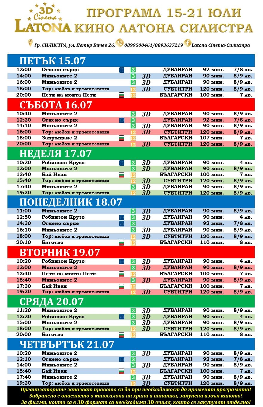 Latona Cinema Силистра: Кино програма - 15.07-21.07.2022 15 Юли 2022 г. Култура 870 Новата филмова седмица е тук със забавни и вълнуващи заглавия за малки и големи: 🍿🎬🎥ТОР: ЛЮБОВ И ГРЪМОТЕВИЦИ🎥 ❤️⚡️⚡️на 3D😎 🍿🎬🎥МИНЬОНИТЕ 2🎥😍🤣🔝🔝 на 3D😎