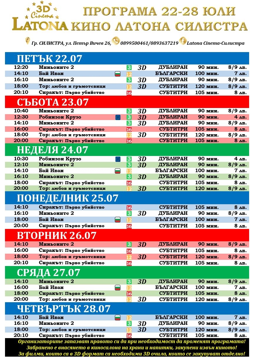 Latona Cinema Силистра: Кино програма - 22-28 юли 2022 22 Юли 2022 г. Култура 1337 Новата филмова седмица е тук със забавни и вълнуващи заглавия за малки и големи: 🍿🎬🎥ТОР: ЛЮБОВ И ГРЪМОТЕВИЦИ🎥 ❤️⚡️⚡️на 3D😎 🍿🎬🎥МИНЬОНИТЕ 2🎥😍🤣🔝🔝 на 3D😎 🍿🎬🎥И една драматична и страховита премиера: 🍿🎬🎥СИРАКЪТ: ПЪРВО УБИЙСТВО🎥