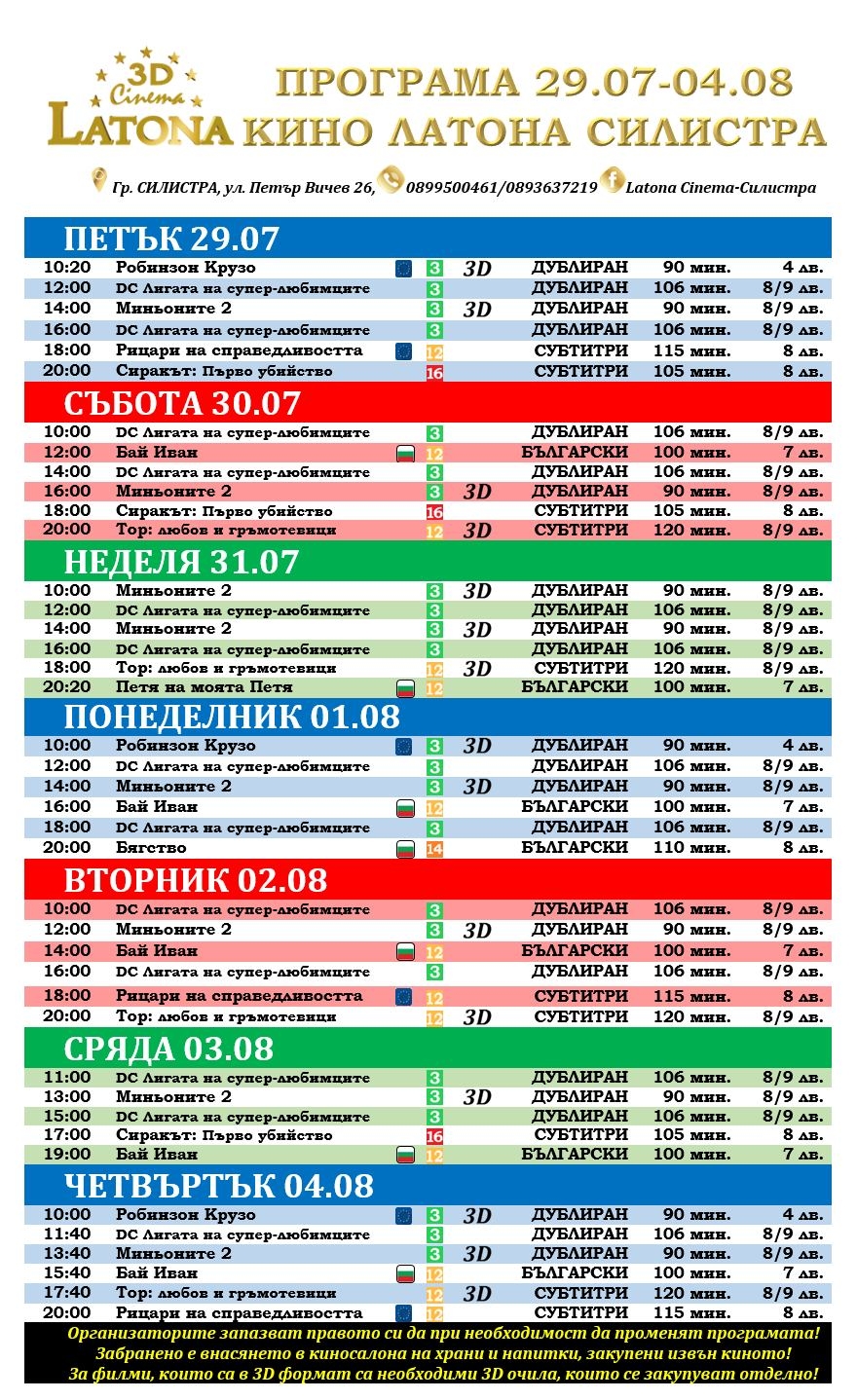 Latona Cinema Силистра: Кино програма - 29.07-04.08.2022 29 Юли 2022 г. Култура 1123 Новата филмова седмица е тук със забавни и вълнуващи заглавия за малки и големи: 🍿🎬🎥DC ЛИГАТА НА СУПЕР-ЛЮБИМЦИТЕ🎥🦸♂️🐶🐾 🍿🎬🎥РИЦАРИ НА СПРАВЕДЛИВОСТТА🎥 🍿🎬🎥ТОР: ЛЮБОВ И ГРЪМОТЕВИЦИ🎥 ❤️⚡️⚡️на 3D😎 🍿🎬🎥МИНЬОНИТЕ 2��😍🤣🔝🔝 на 3D😎 🍿🎬🎥СИРАКЪТ: ПЪРВО УБИЙСТВО🎥