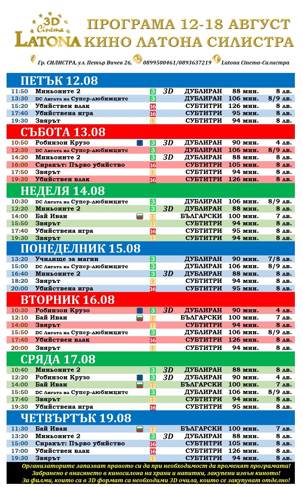 Latona Cinema Силистра: Кино програма - 12.08-18.08.2022 11 Август 2022 г. Култура 1160 Новата филмова седмица е в Силистра с забавни и вълнуващи заглавия за малки и големи: 🍿🎬🎥ЗВЯРЪТ🎥 🔪🦁👨👧👧 🍿🎬🎥УБИЙСТВЕНА ИГРА🎥 🔪 🍿🎬🎥УБИЙСТВЕН ВЛАК🎥 🚈🚉 🍿🎬🎥DC ЛИГАТА НА СУПЕР-ЛЮБИМЦИТЕ🎥🦸♂️🐶🐾 🍿🎬🎥МИНЬОНИТЕ 2🎥😍🤣🔝🔝 на 3D😎 🍿🎬🎥СИРАКЪТ: ПЪРВО УБИЙСТВО🎥