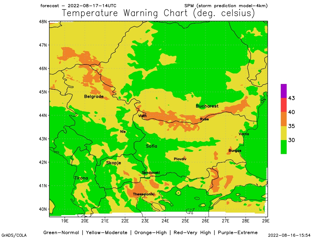 Картата е базирана на регионалния числен модел SPM и показва районите, където температурите ще са най-високи. Районите със зелен цвят ще са по-безопасни и градусите там ще са около 30 градуса.
