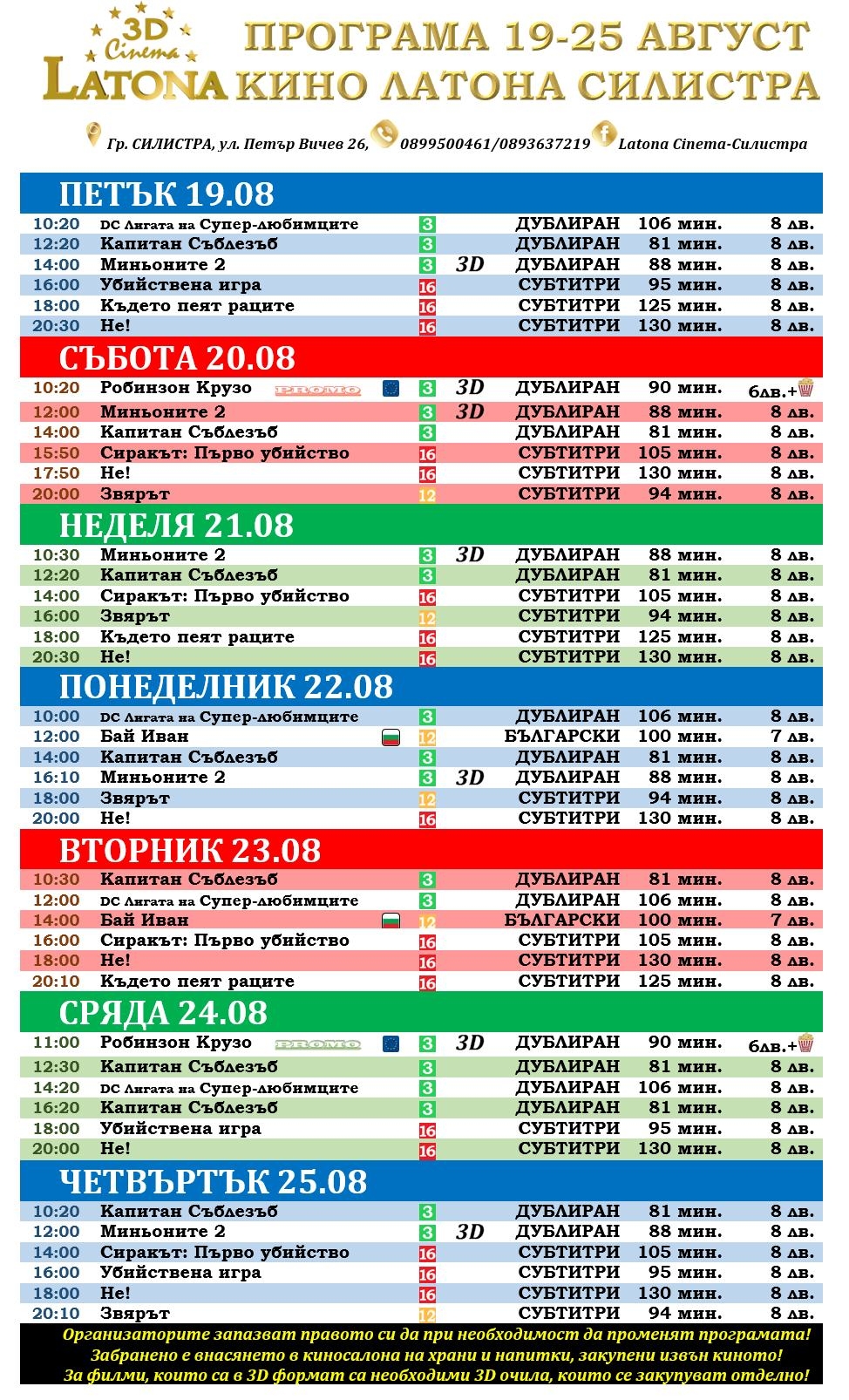 Latona Cinema Силистра: Кино програма - 19.08-25.08.2022 19 Август 2022 г. Култура 891 Новата филмова седмица е тук❣️ Очакват Ви спиращи дъха премиери, както и забавни и вълнуващи заглавия за малки и големи: 🍿🎬🎥КАПИТАН СЪБЛЕЗЪБ И МАГИЧЕСКИЯТ ДИАМАНТ🎥🌴⚓️💎 🍿🎬🎥КЪДЕТО ПЕЯТ РАЦИТЕ🎥🏃♀️🦀🍃🎼 🍿🎬🎥НЕ!🎥☁️👽